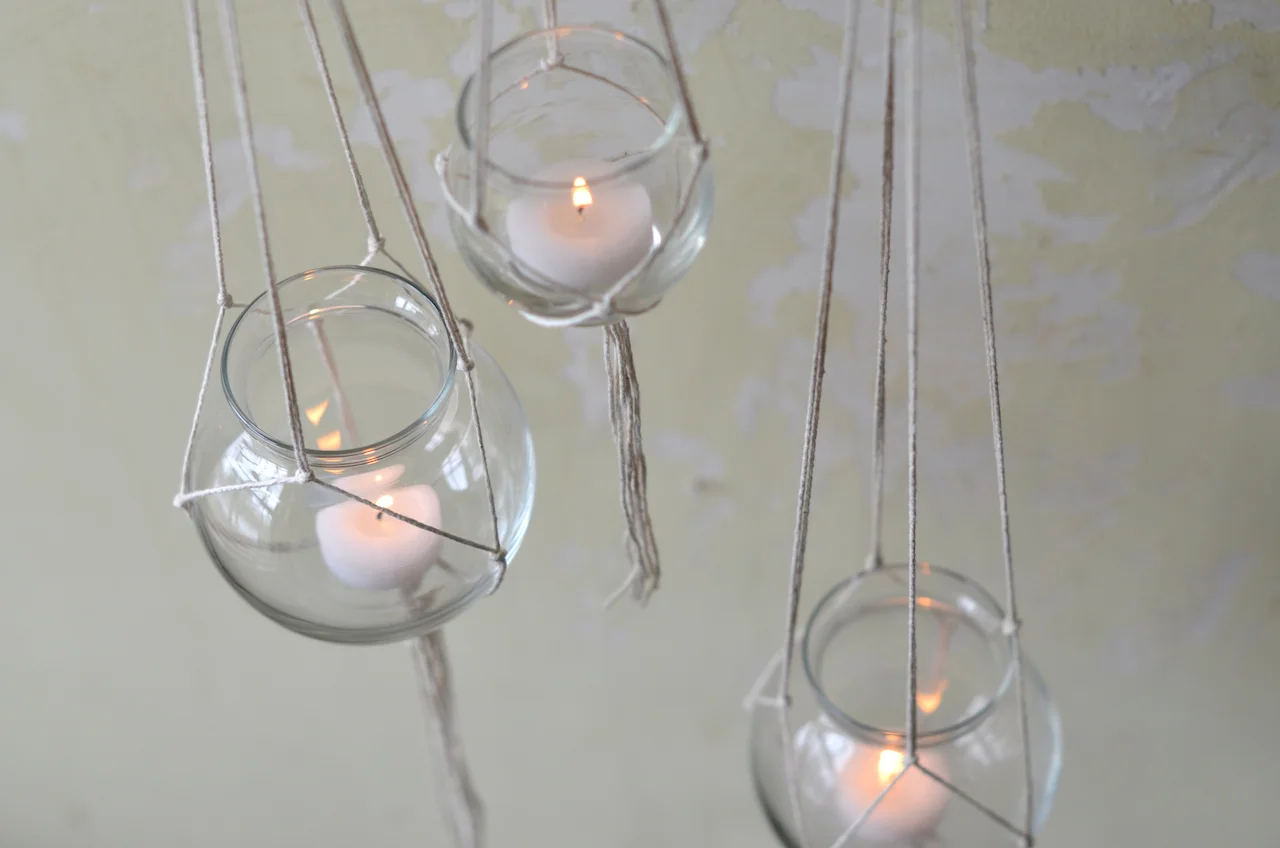 For the candle holders use six or eight pieces of twine, tying them together a couple inches from the bottom. Seperate the strings into pairs and tie each pair together. Seperate the strings again, pairing each with the one from the pair next to it and tying them together. You can repeat that as many times as you like. Then wrap them around the branch, and double knot (you can also add some hot glue here too to secure). Insert your candles, and you’re done!
